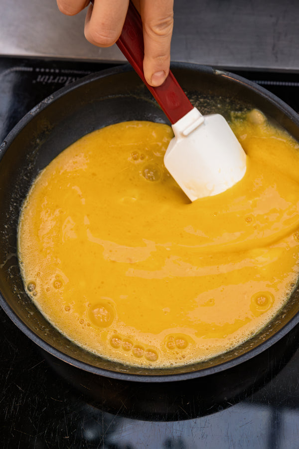 - In a nonstick pan, melt the butter over low heat. Crack the eggs into a bowl and whisk until smooth. Pour the eggs into the pan and cook slowly, stirring constantly with a silicone spatula, until just set and creamy — about 5-6 minutes. Add the grated cheese, season with salt and pepper, mix through and remove from heat.
