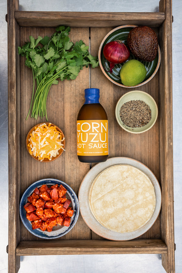 - For assembling the tacos, take a tortilla and add a spoonful of scrambled eggs. Top with crisp chorizo, add diced avocado and a few pickled red onion slices. Finish with chopped coriander and a drizzle of Corn Yuzu Hot Sauce.