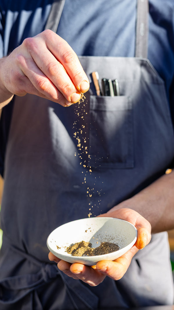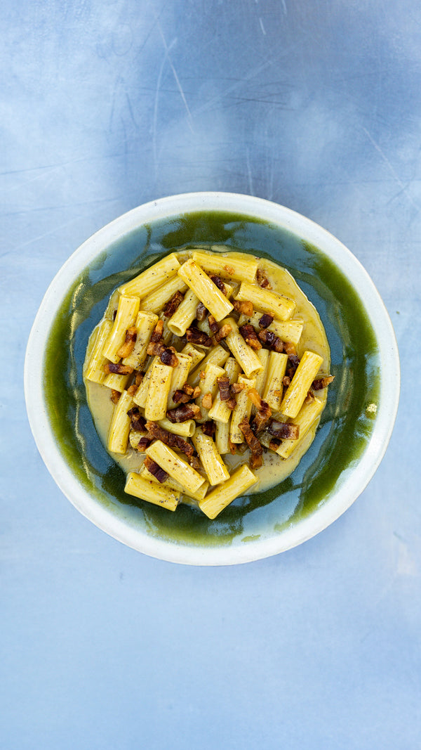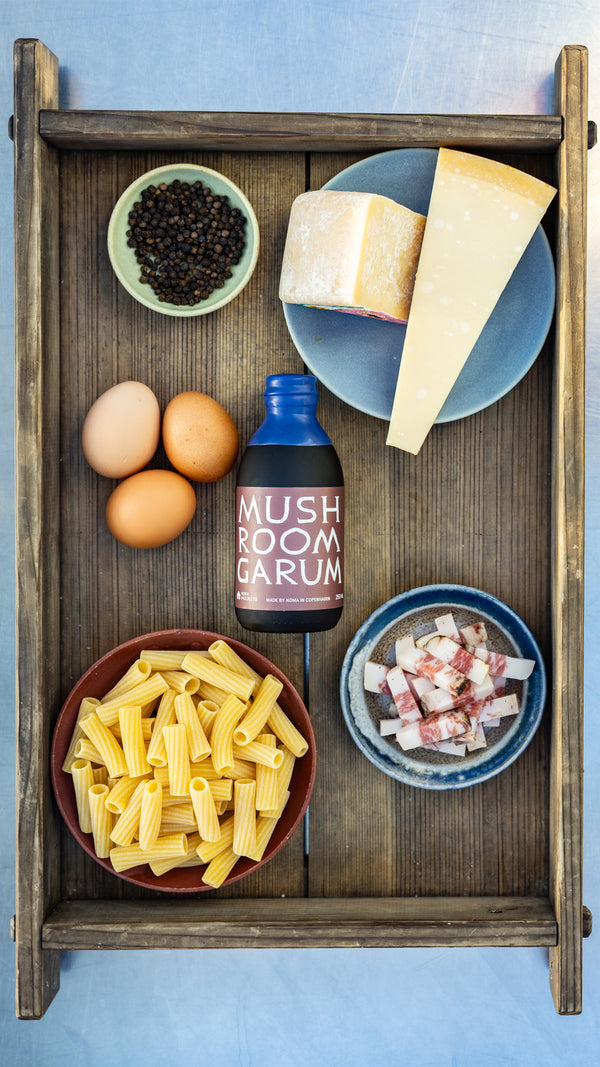 - Slowly add drops of the hot pasta water to the mixing bowl containing the eggs and stir vigorously. When the mixture has loosened and is no longer a stiff paste, add the cooked pasta along with some freshly ground black pepper and mix well to coat the pasta in the egg mixture. If the pasta is a bit dry, add a bit more pasta water to loosen the sauce. Taste and adjust the seasoning with salt. When the pasta is well coated in a silky, velvet of garum & egg mixture, transfer the pasta to 4 serving bowls and top with freshly cracked black pepper, the crispy bacon pieces, and a spoonful of grated pecorino. Serve immediately.