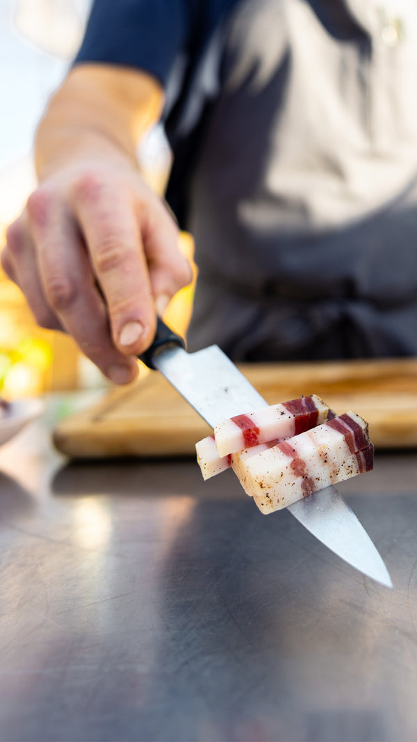 - Bring a large pot of water to a boil, add salt so that the water tastes seasoned, but not “salty”. (If in doubt, err on the lower end of the spectrum - you can add salt later to the finished pasta, and the bacon will also contribute some salt, too).