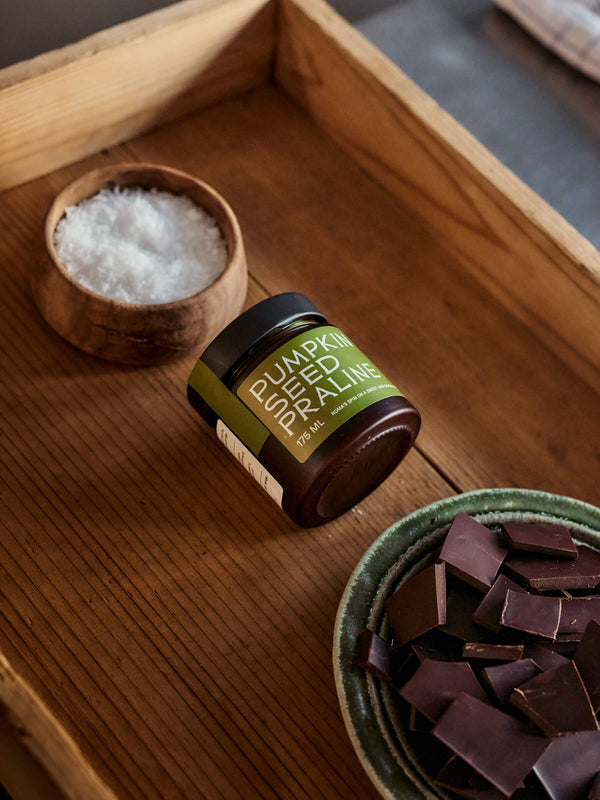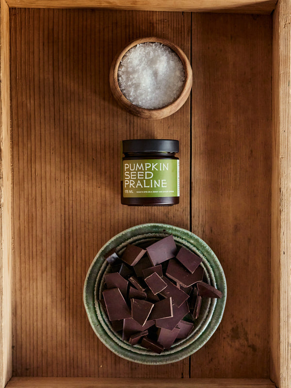 Transfer mixture into serving bowls. Top the mousse with a spoonful of Pumpkin Praline, a touch of sea salt, and more chocolate shavings, if you like.