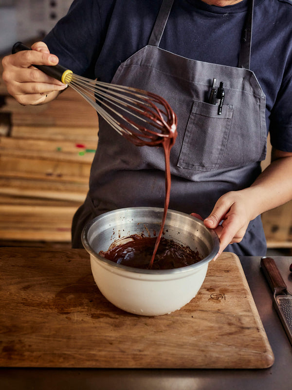 Place your chopped chocolate into a large mixing bowl. Pour the boiling water on top, and whisk until the chocolate has completely melted.