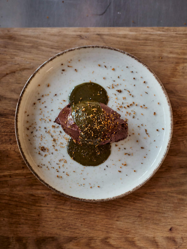 This mousse has such pure chocolate flavor because of a technique developed by the molecular gastronomist Hervé This that only calls for water and the main ingredient. It’s also plant-based, a bit easier on the stomach, and just wonderful, especially thanks to a final flourish of Pumpkin Praline. Grate some Pumpkin Bushi on top, if you like, for even deeper deliciousness.