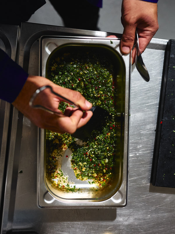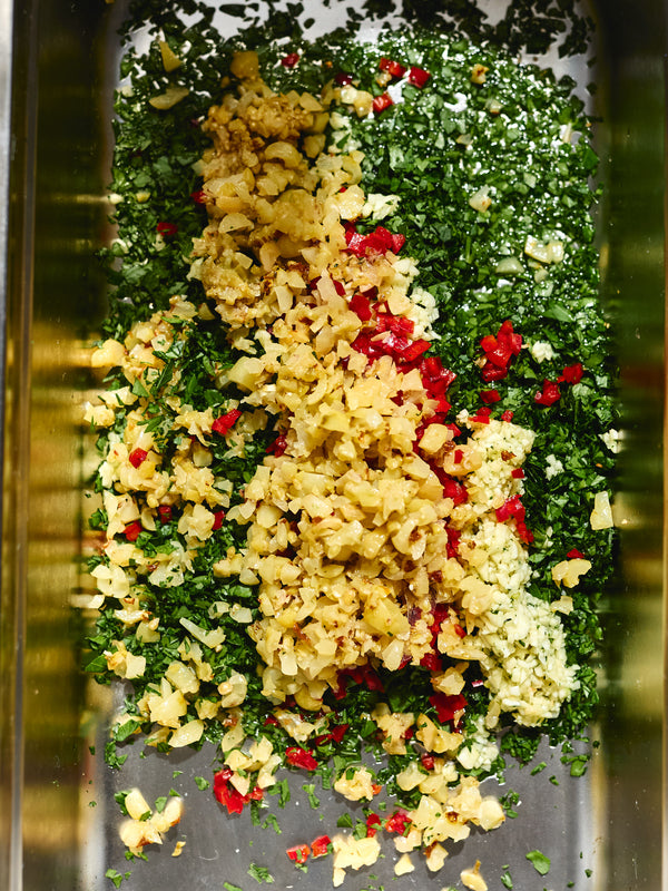 - Mix together the Summer Pickles, garlic, parsley, oregano, and chili.ย Add the Wild Rose Vinegar, Summer Pickle pickling liquid, and olive oil. Season to taste with the brine.