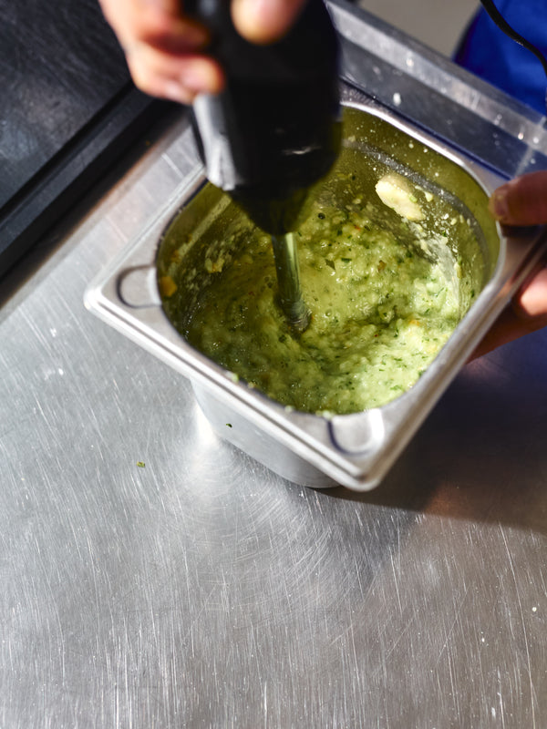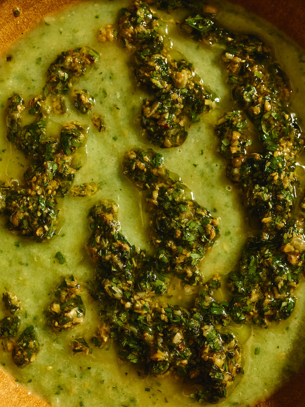 - To serve, mix the garnishes in a bowl, season with the Forager's Vinaigrette, and drizzle over the soup.ย