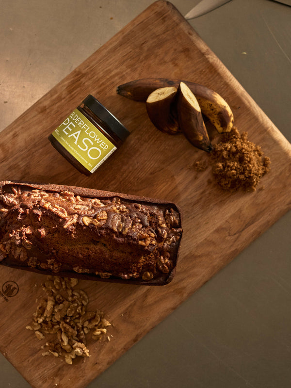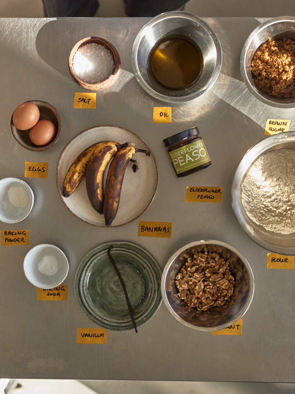 - In a large bowl, mash the bananas. Add the sugar and the eggs, and whisk. Then add the milk, oil, Elderflower Peaso, and vanilla extract. Continue whisking until everything is well combined