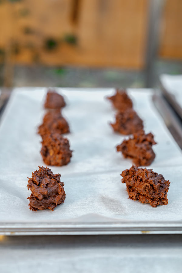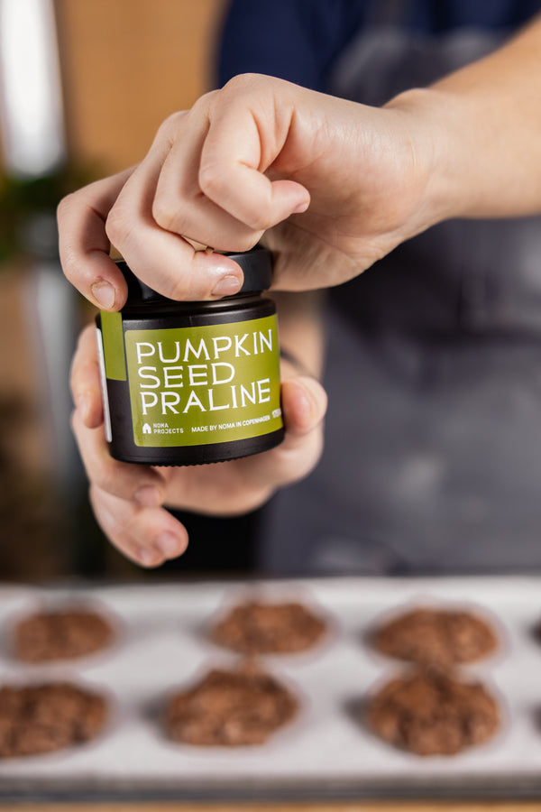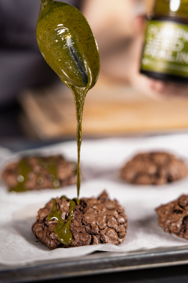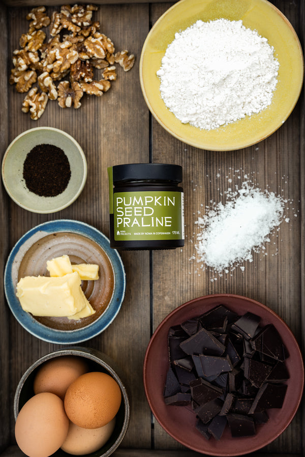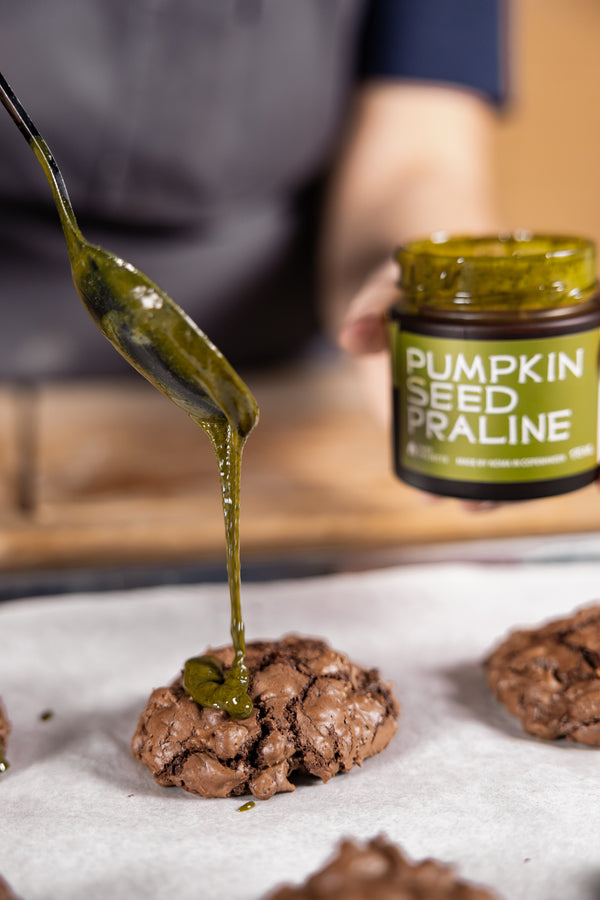 These fudgy dark chocolate cookies are crispy on the outside, molten in the middle, and loaded with chocolate chunks and walnuts. A drizzle of Pumpkin Seed Praline adds a nutty finish that will have you reaching for another... and then another.