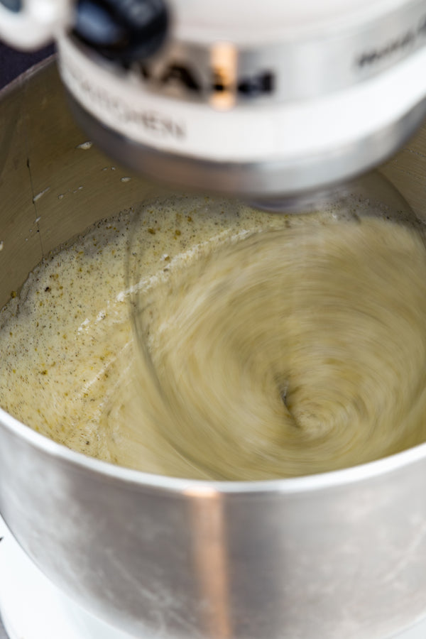 - In a mixer add the eggs, sugar and vanilla paste. Whip until ribbon consistency is achieved.