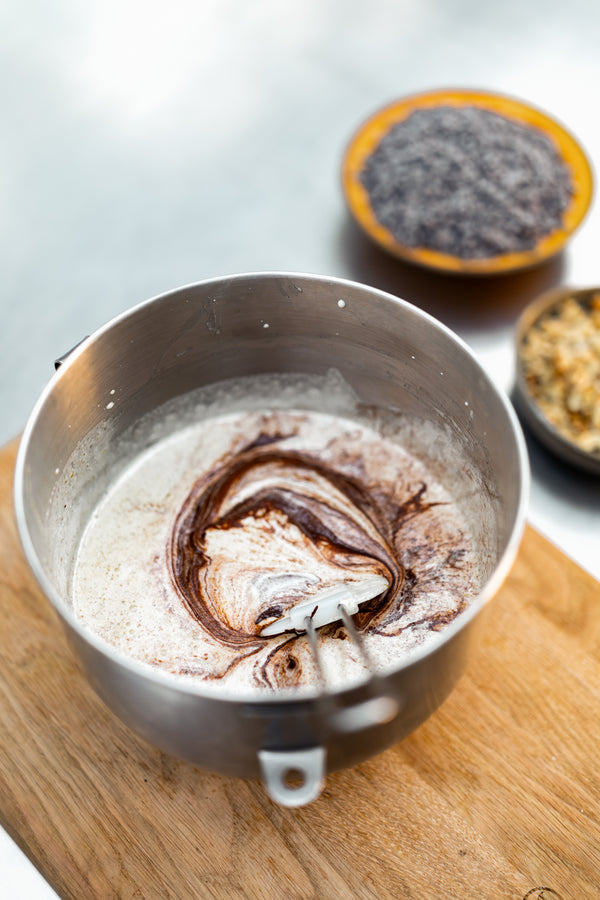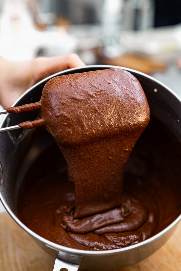 - Combine the melted ingredients into the mixer, and combine.