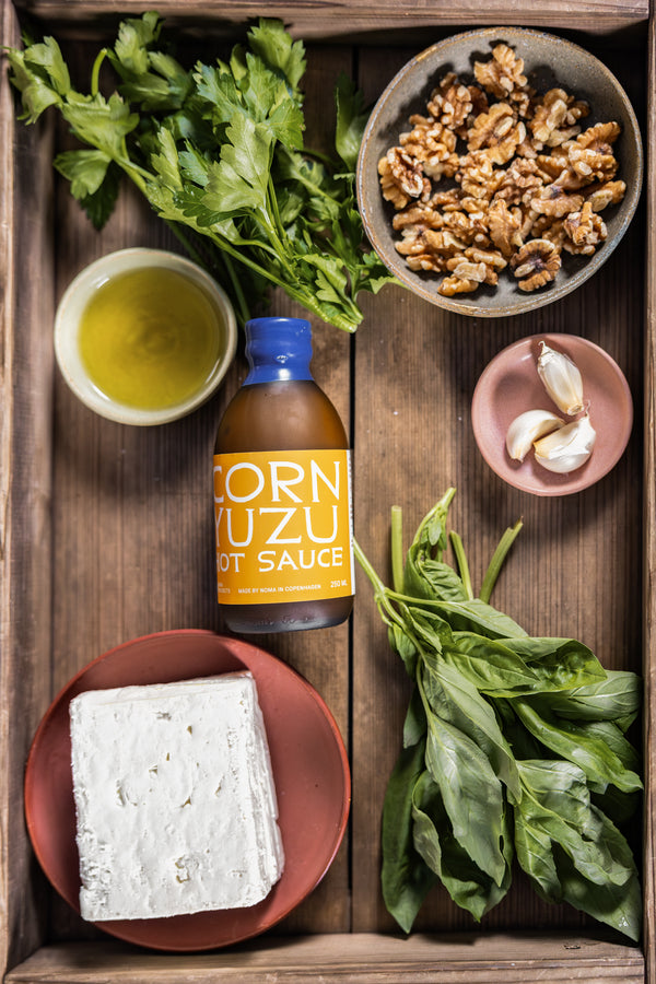 - Fold in the chopped walnuts and mix through. Season with black pepper and transfer to a serving bowl and drizzle with a little extra Corn Yuzu Hot Sauce to finish.