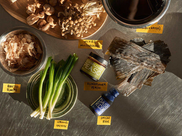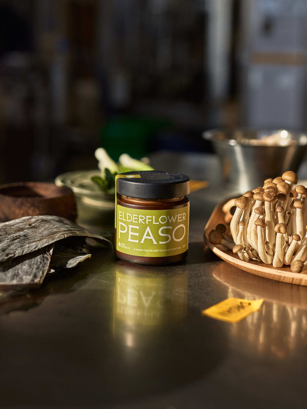 - Put the dashi back on the heat and add in your mushrooms. Let them cook for 3-4 minutes. Then, in a small bowl, put the Elderflower Peaso along with some of the dashi, just enough to mix them together. Use a whisk or a hand blender. After mixing, add to the pot.ย ย