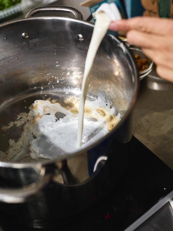 - Add the milk, reduce to low heat, and let it infuse with the cardamom for about 5 minutes.ย