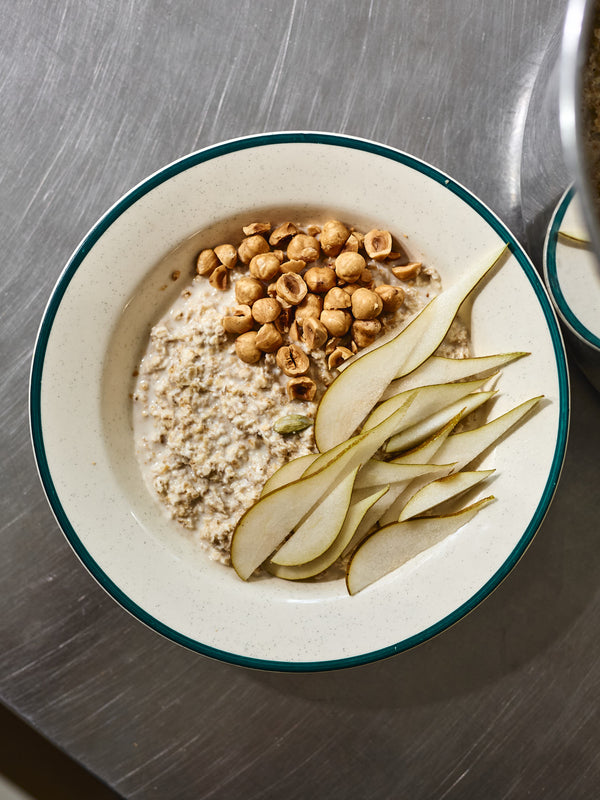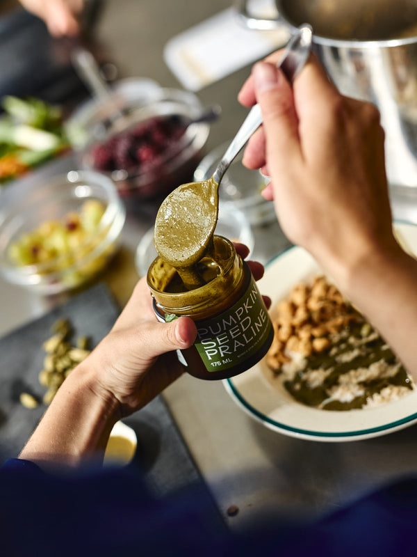 - Top with sliced fruit and crushed nuts and drizzle a spoonful of Pumpkin Seed Praline over the top.ย