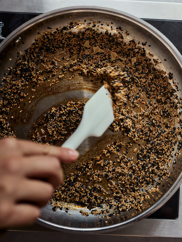 To the pan, add your sesame seeds and black sesame seeds, followed by the sugar, rice vinegar, and soy sauce. Simmer gently for two or so minutes, until the liquid has mostly evaporated and reduced and everything is homogenous.
