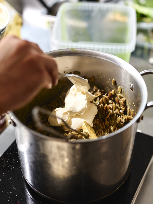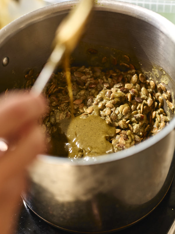 - Once the pumpkin seeds are tender, add the herb broth to the pot. Stir continuously, letting it reduce, much like you would when making a traditional rice risotto.ย