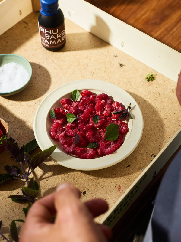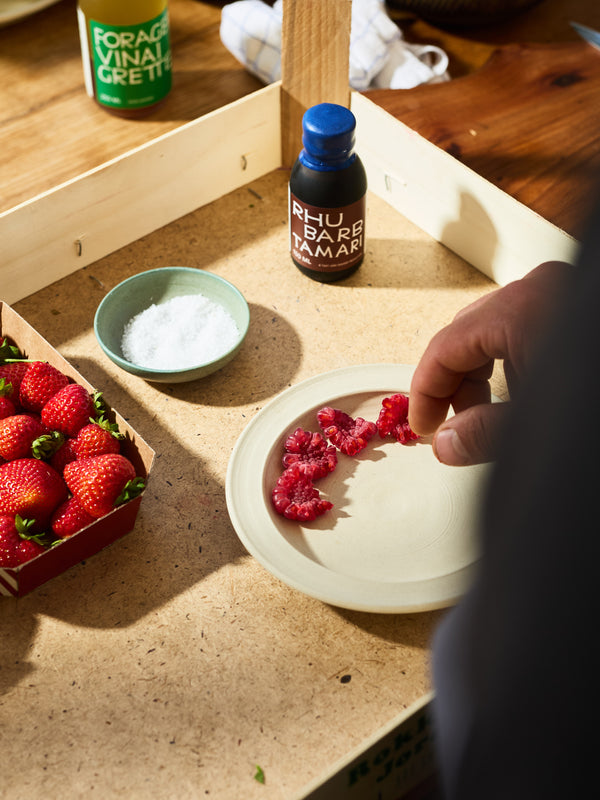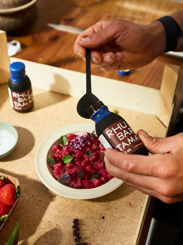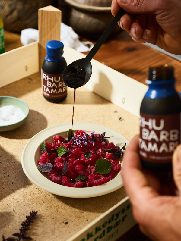 - Give them a good drizzle of Rhubarb Tamari, season with salt, and garnish with seasonal herbs.