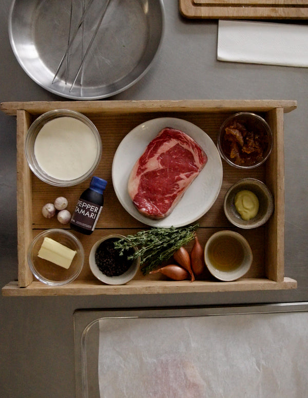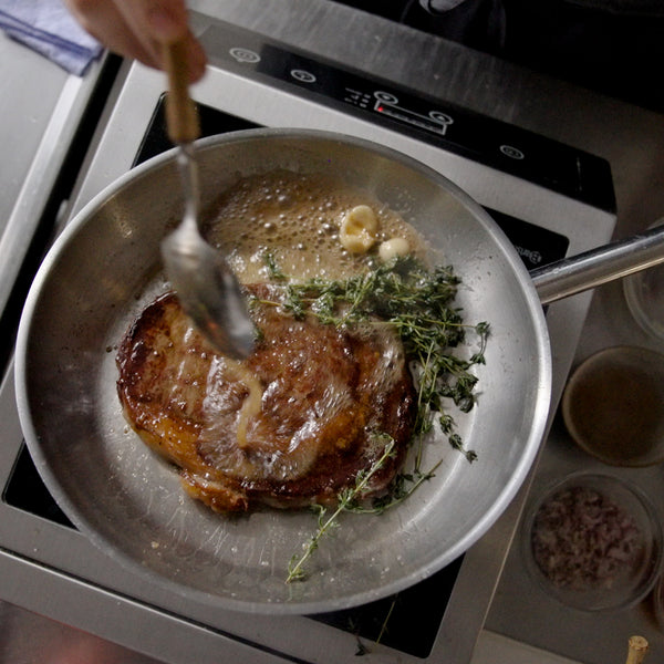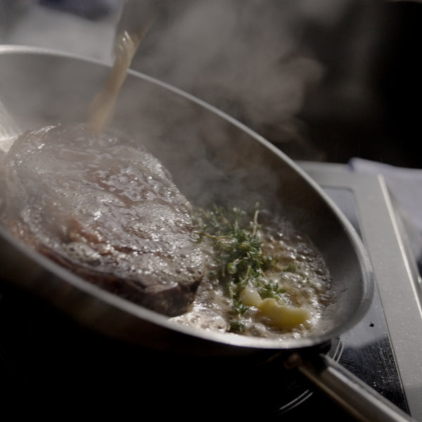 - Add the butter to the pan, along with the thyme and garlic, and baste your steaks with the foaming butter. Once the steaks are done, remove them from the pan, along with the aromatics, and allow to rest (cover the top to prevent them from getting cold while you make the sauce.) Leave some butter in the pan.