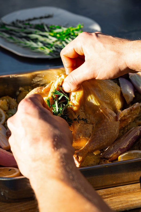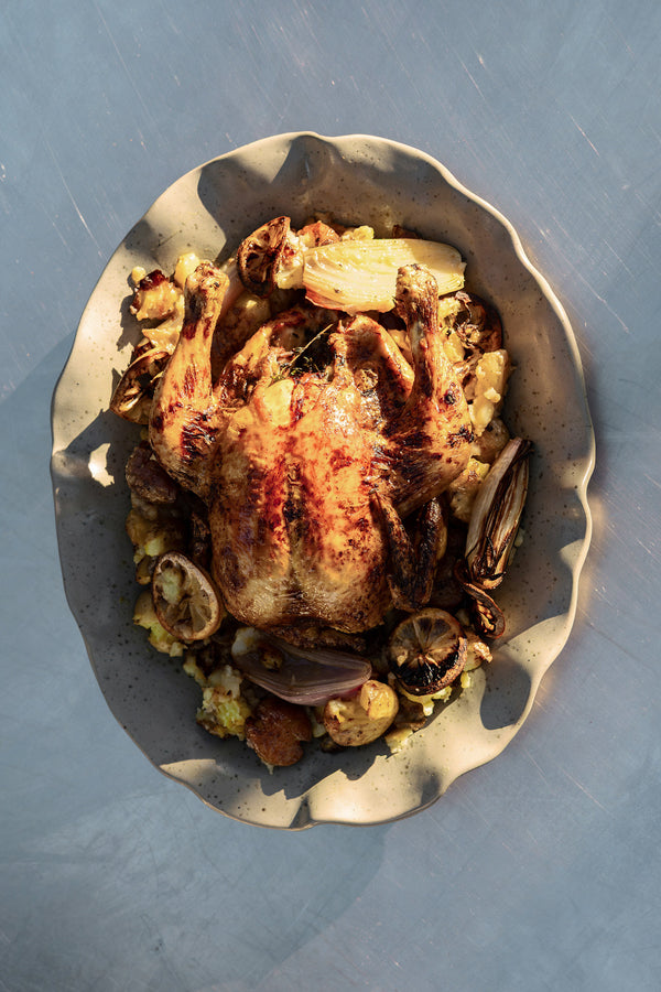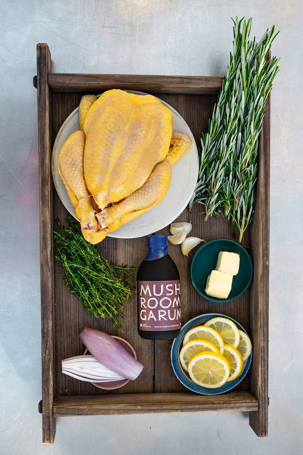There’s roast chicken, and then there’s roast chicken with mushroom garum butter. This umami-rich seasoning adds a bold flavor that melts into crispy potatoes and lemony goodness.