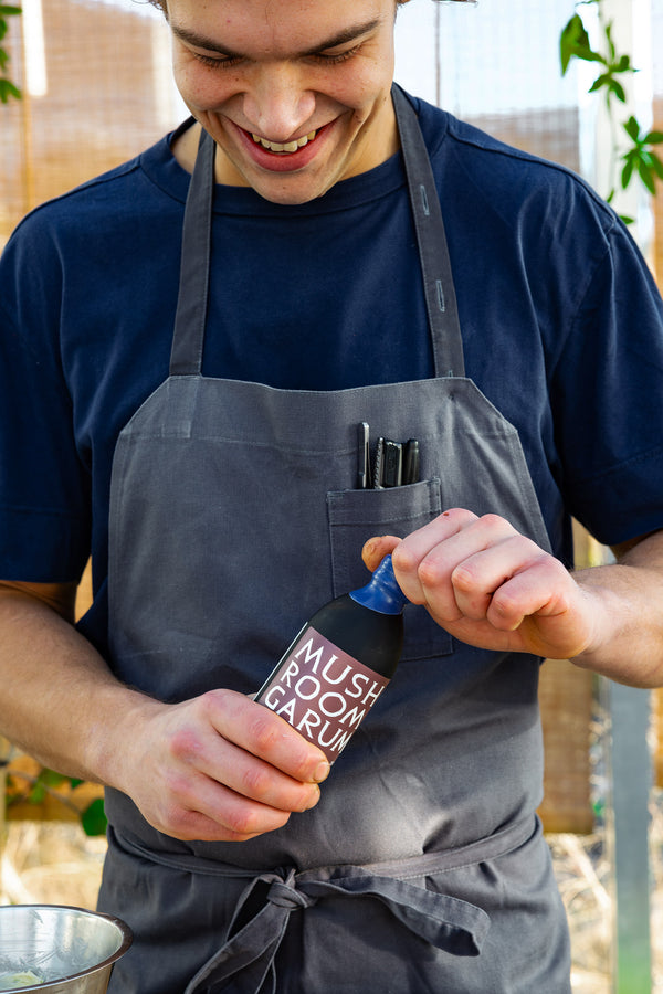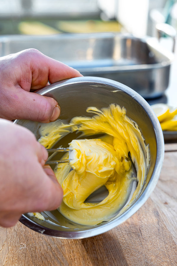 - In a bowl, combine the butter, mushroom garum, lemon zest, and pepper. Mash or whip until fully smooth and uniform.