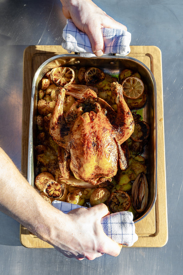 - Place the parboiled potatoes on a roasting tray and top with more shallots and sliced lemons. Place the chicken on top, and roast at 220°C for 25 minutes. Then turn the temperature down to 180°C and cook for a further 15 minutes.