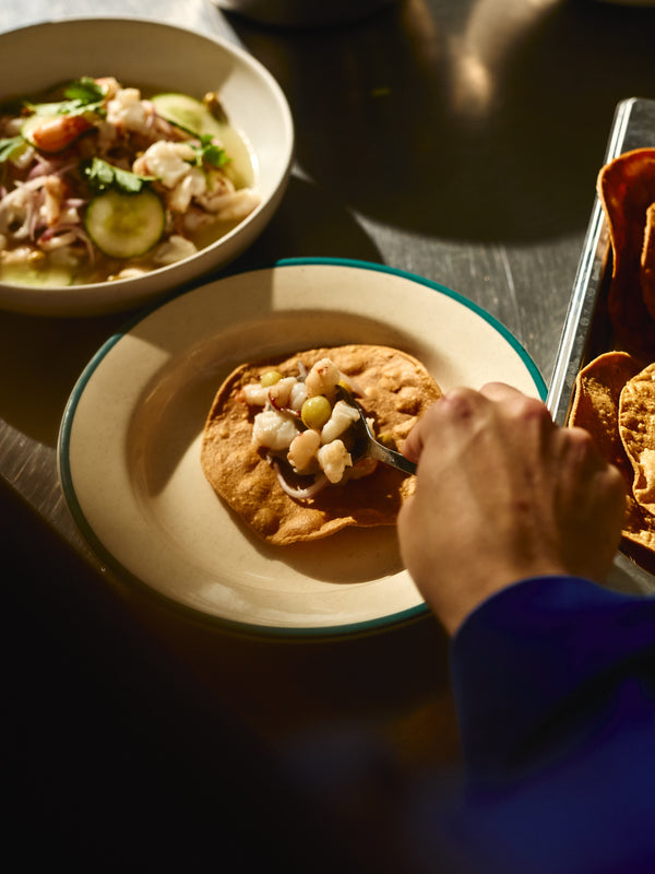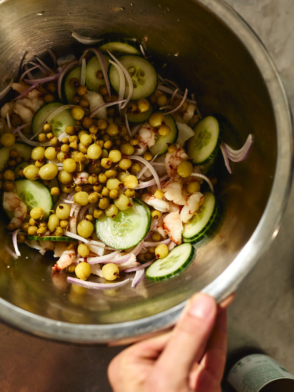 - Add the shrimp, cucumber, avocado, onion, and Summer Pickles to a bowl and mix with the leche de tigre.