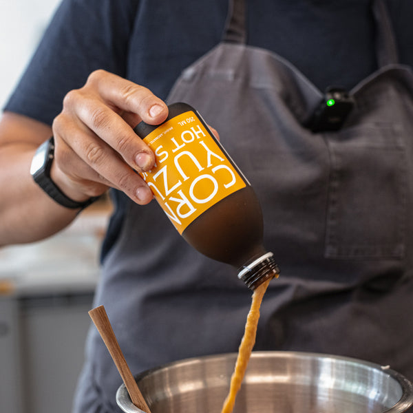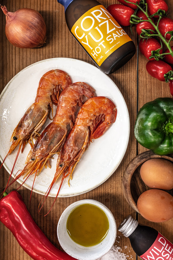 - Place the shrimps in a mixing bowl. Add a generous amount of olive oil and season with salt to taste. Add Corn Yuzu Hot Sauce and Rose Vinegar and toss together until well incorporated. Enjoy!