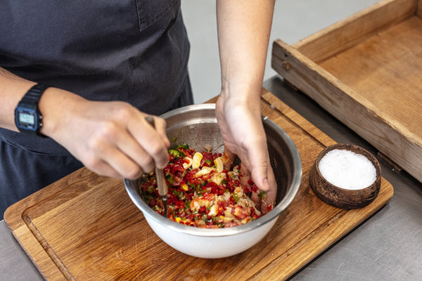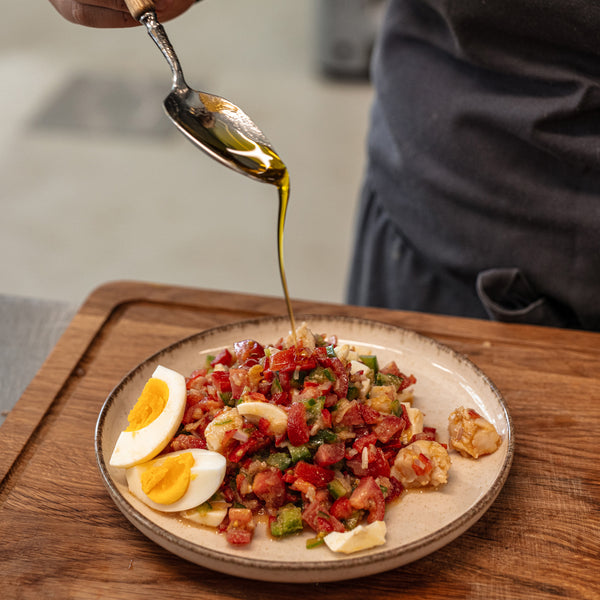 People have been eating salpicón since the days of Cervantes, maybe even longer. The version Don Quixote sustained himself with probably featured boiled beef. Today, most people in Spain and Latin America would describe the dish as a fresh and homey seafood salad that is all about keeping things loose (after all, the word “salpicón” translates to“medley”). We recommend chopping up the best seafood, adding some peppers and tomatoes, and binding it all together with acid and oil, just like our Head of Production Cristina Megías learned to do from her grandmother in Spain.