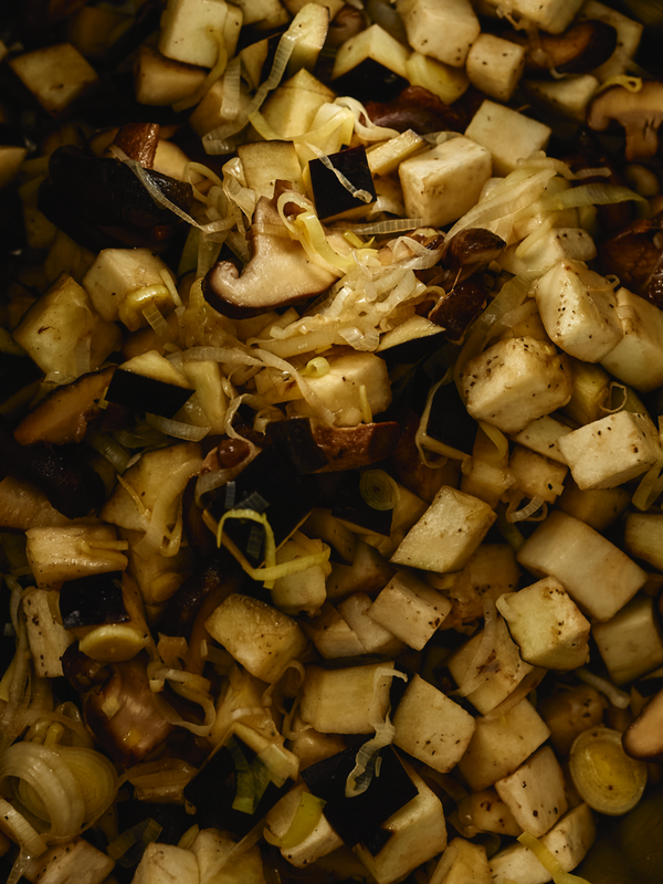 - Start by preparing the filling: Stir fry the spinach with some garlic until wilted. Remove and set aside. In the same pan, stir fry the mushrooms until golden brown. Add the leek and eggplant, cooking until tender. Add a splash of water or broth and some mushroom garum to achieve a saucy consistency. Set aside.