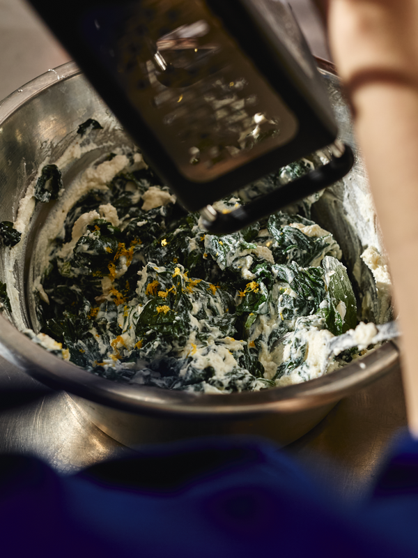 - Combine the cooked vegetables with the ricotta. You can either mix everything together or layer the spinach and ricotta separately from the mushroom mixture. Season with salt, pepper, and lemon zest.