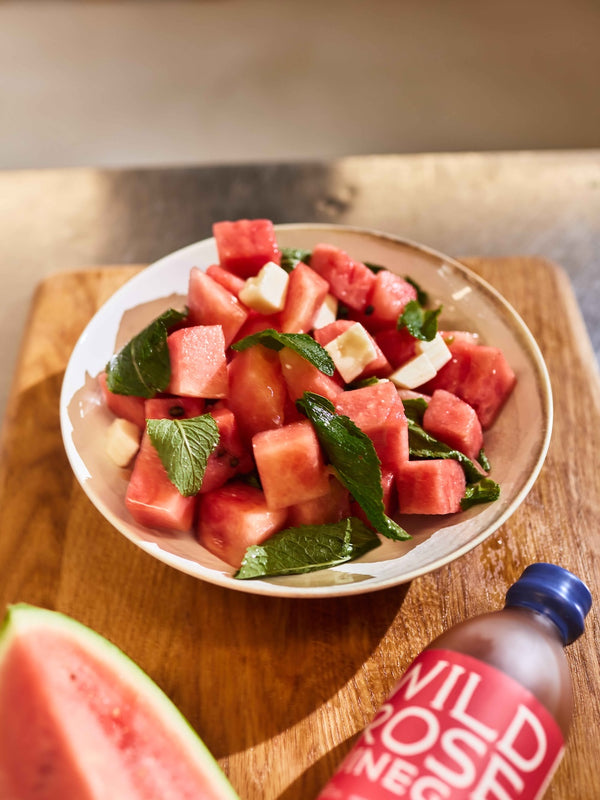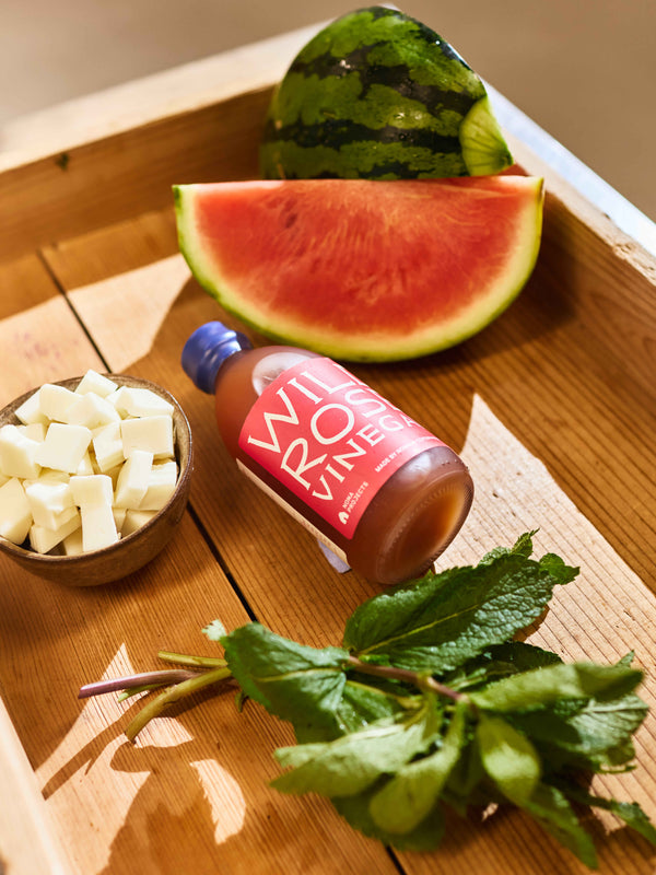 The floral brightness of Wild Rose Vinegar balances the sweetness of the watermelon while also bringing out its freshness and flavor. If your melon isn’t too sweet, consider adding a touch of brown sugar to the recipe for maximum effect. We like goat feta and mint for this recipe, but pretty much any herb or cheese you like will be great. Just make sure to serve this salad cold. Very cold.